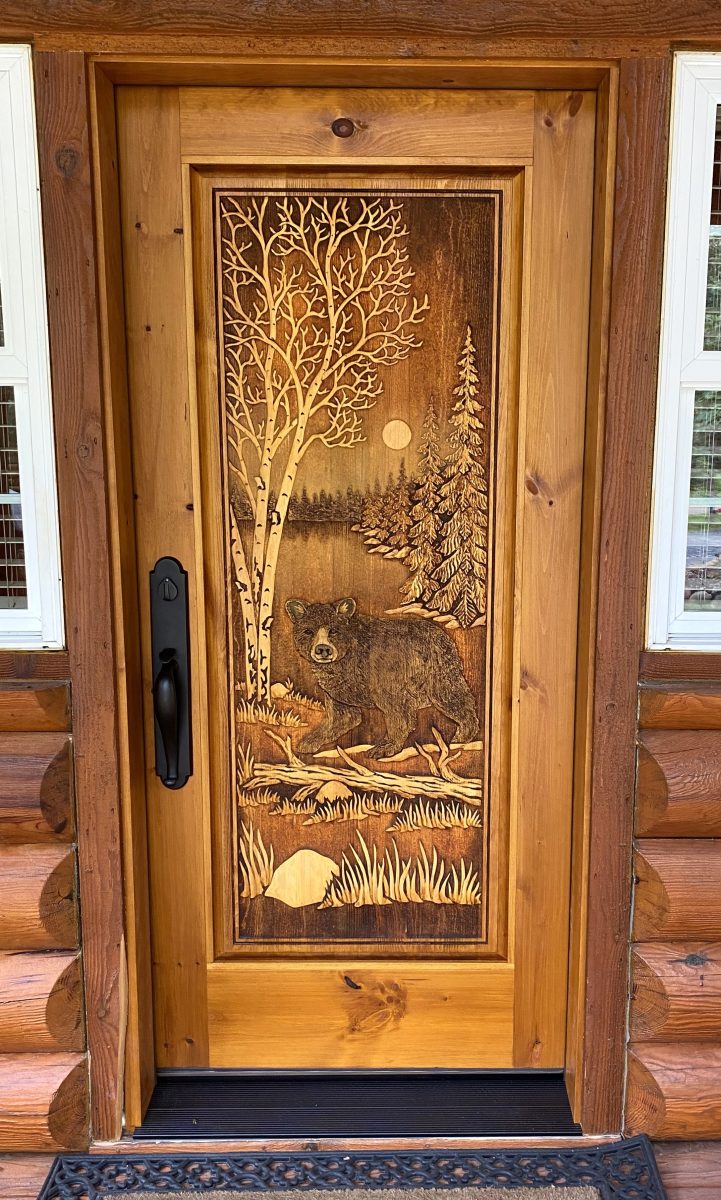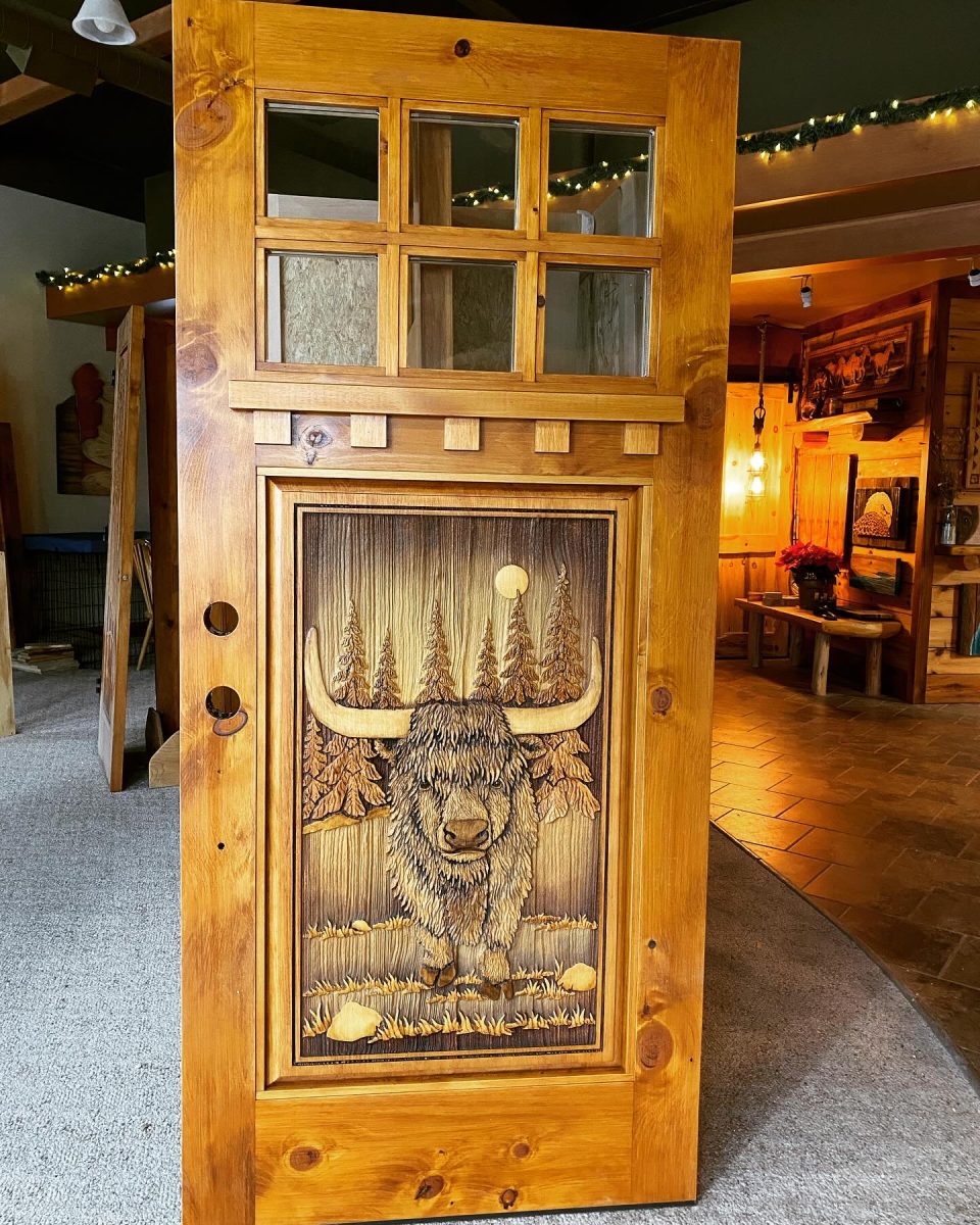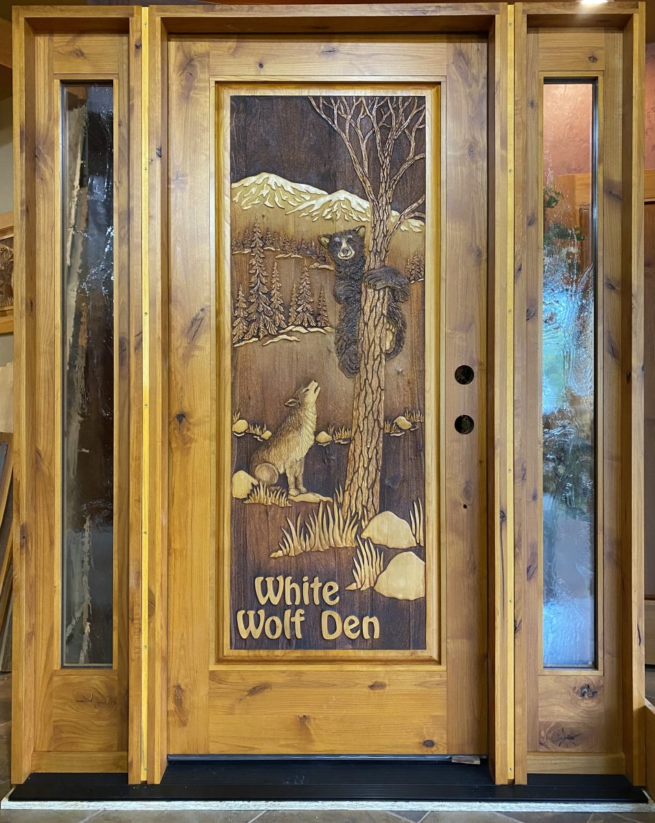 When it comes to our products, we provide the entire door unit, not just a door. This could include a single door, double door, single door and sidelites, or any other combination all pre-hung in jamb. We then work closely with homeowners and contractors alike to select and craft the perfect carved image for your dream door. Our unique approach includes a blend of sand carving and hand-carving techniques, ensuring each design – from subtle pine boughs to intricate wildlife and scenic landscapes – is brought to life with remarkable detail. You won’t find a computer doing work in our shop, unless we’re sending an email.